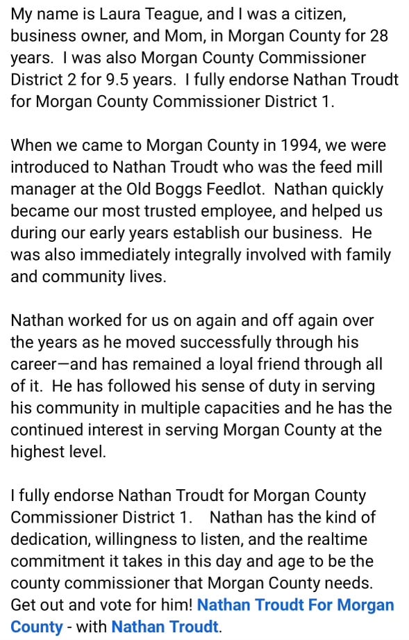 This campaign is not just about me; it's about all of us and the future we envision for Morgan County. Let's work together to address the challenges and create a thriving community that works for everyone. Whether you have questions, concerns, or ideas, I'm here for you.